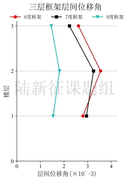 将典型台站记录输入立面布置如图76(a)所示的6度、7度和8度设防的典型三层钢筋混凝土框架结构,得到其层间位移角包络如图6 (b)所示。