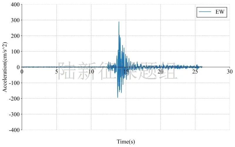 HEB0065典型台站位置北纬39.73度,东经118.75度(图1,其中红色标记为震中位置),记录到水平向地震动峰值加速度为288.8cm/s/s,竖直向地震动峰值加速度为101.6cm/s/s。该地震动及反应谱如图2、图3所示。