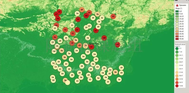根据当地地形数据、岩性数据和实测地面运动记录,可以计算得到不同滑坡体饱和比例下的滑坡分布,如图6所示。其中,底图为当地坡度分布图,每个圆圈代表每个台站的计算结果,圆圈中的数字代表发生滑坡的临界坡度,台站附近坡度大于该数值的地方滑坡发生概率高。