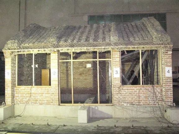 选取图7所示纪晓东等开展的单层未设防砌体结构振动台试验模型,输入典型台站记录,分析结果表明该结构将处于毁坏状态。(纪晓东等,北京市既有农村住宅砖木结构加固前后振动台试验研究,建筑结构学报,2012,11,53-61.)